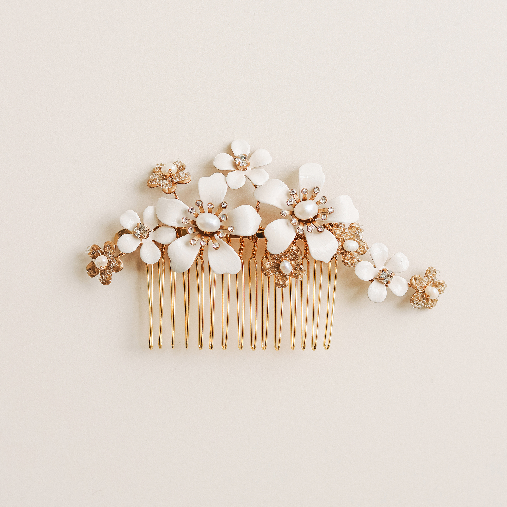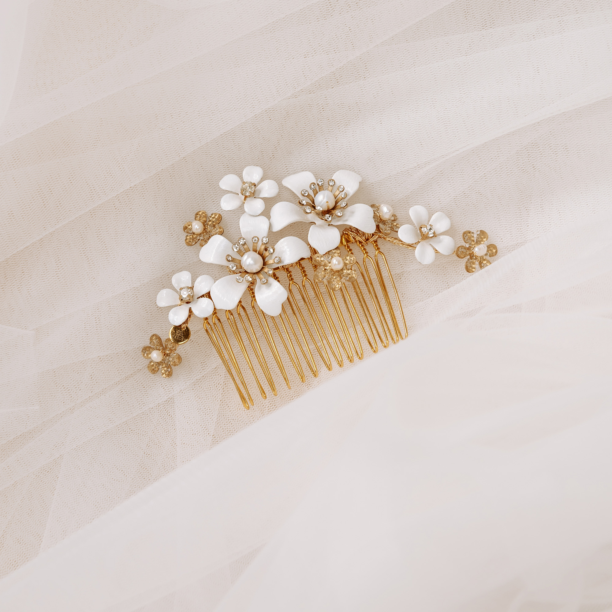 Nježan i romantičan češljić s cvijećem i lišćem u nježnim zlatnim i bijelim tonovima. Ukras je rađen od fleksibilne žice te se krajevi mogu nježno prilagoditi glavi. Ukras je ručno dorađen do najsitnijih detalja.