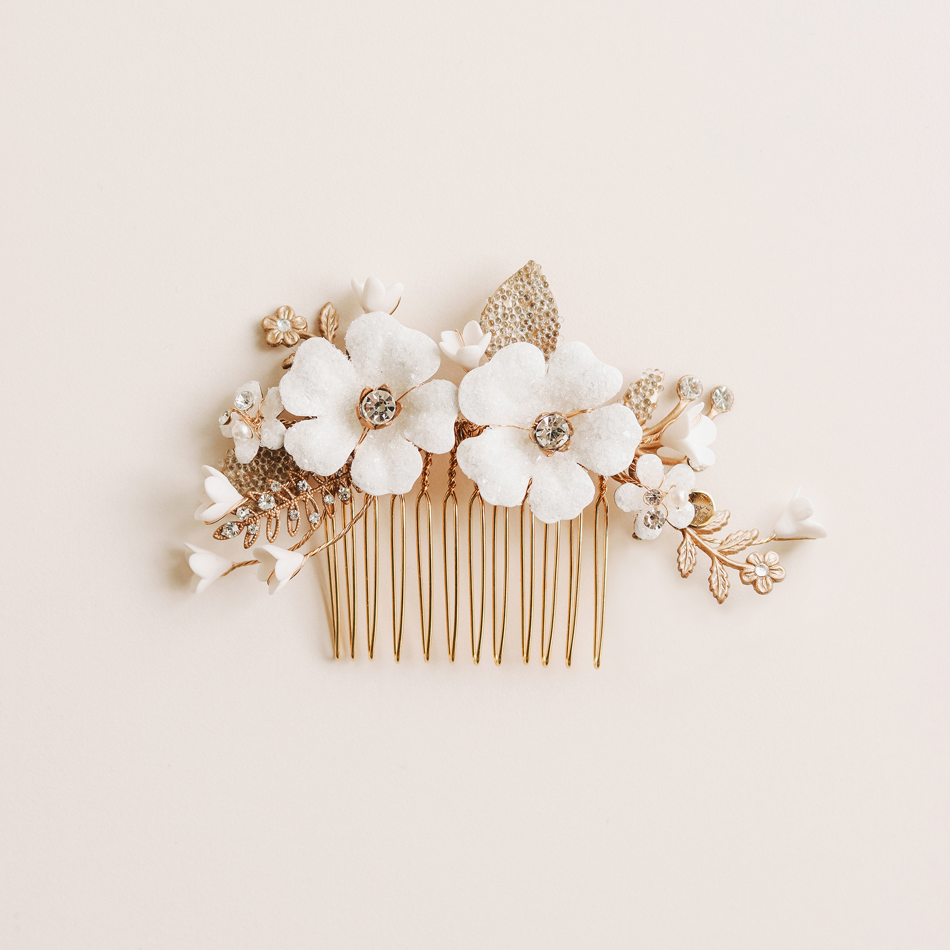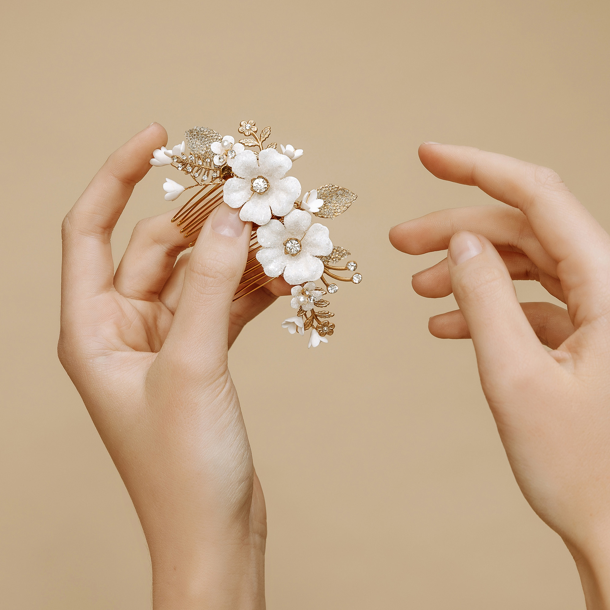 Romantičan češljić s cvijećem i lišćem u nježnim zlatnim i bijelim tonovima. Ukras je rađen od fleksibilne žice te se krajevi mogu nježno prilagoditi glavi. Ukras je ručno dorađen do najsitnijih detalja.