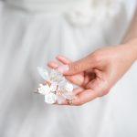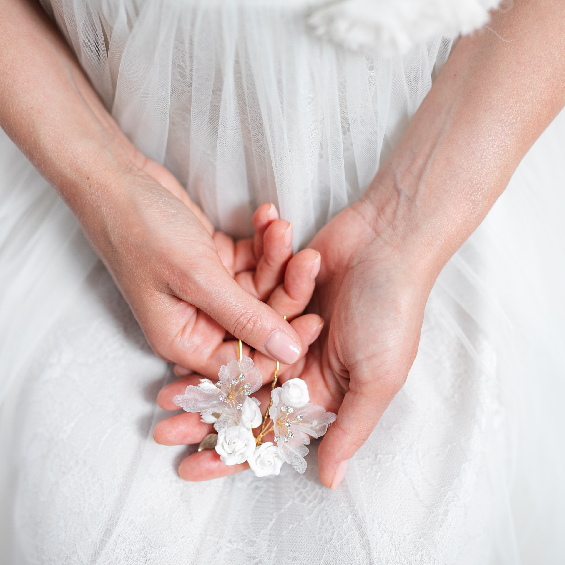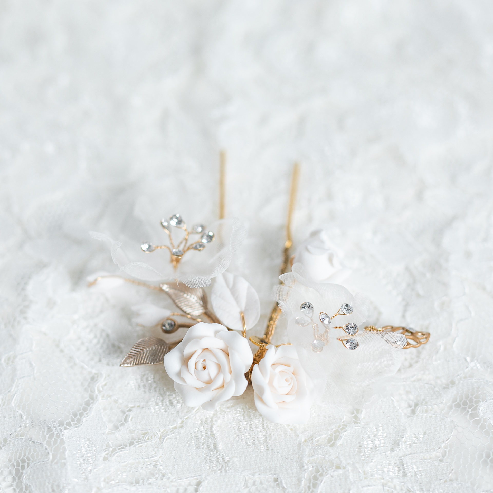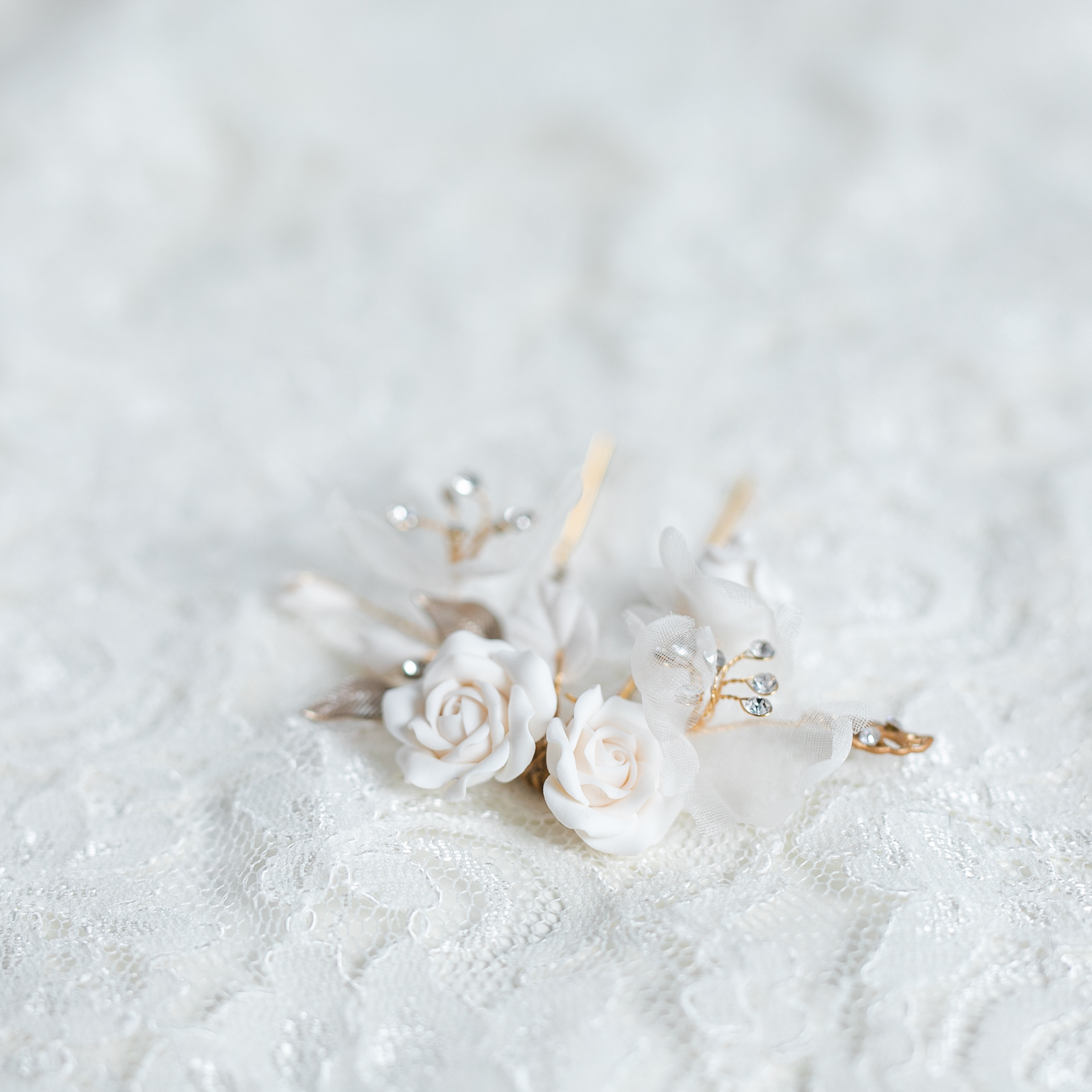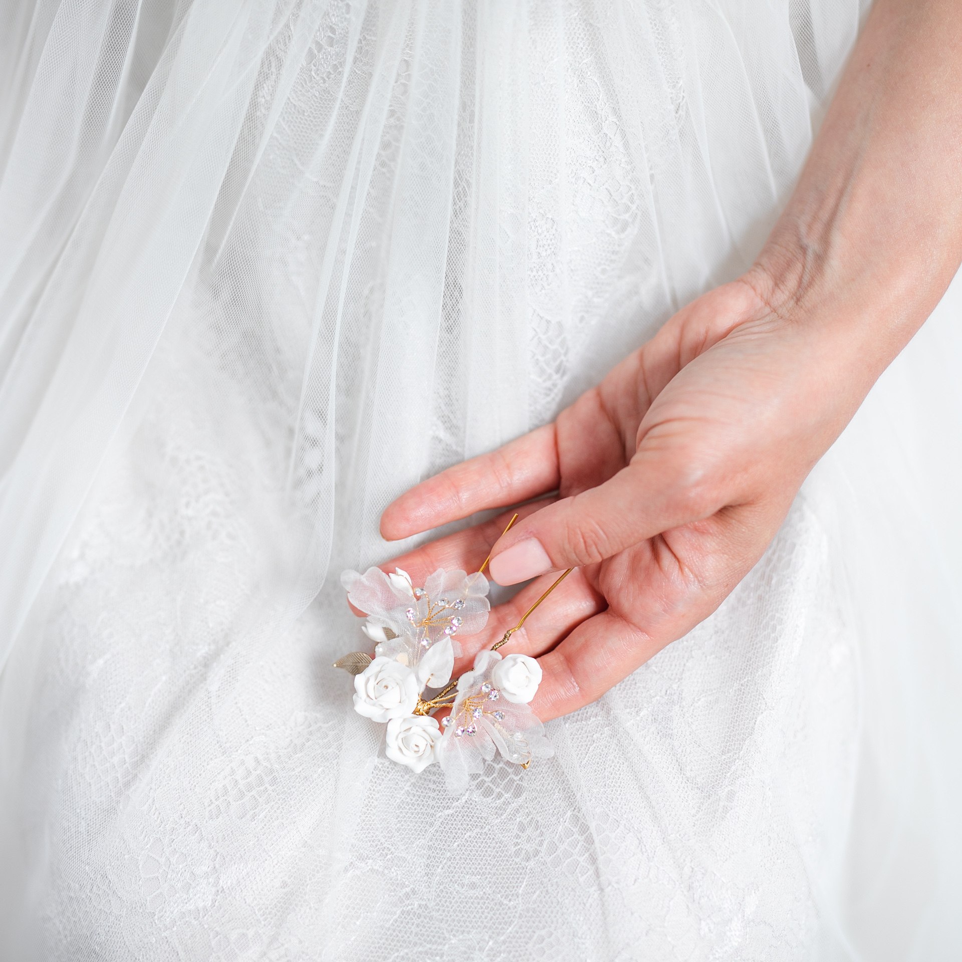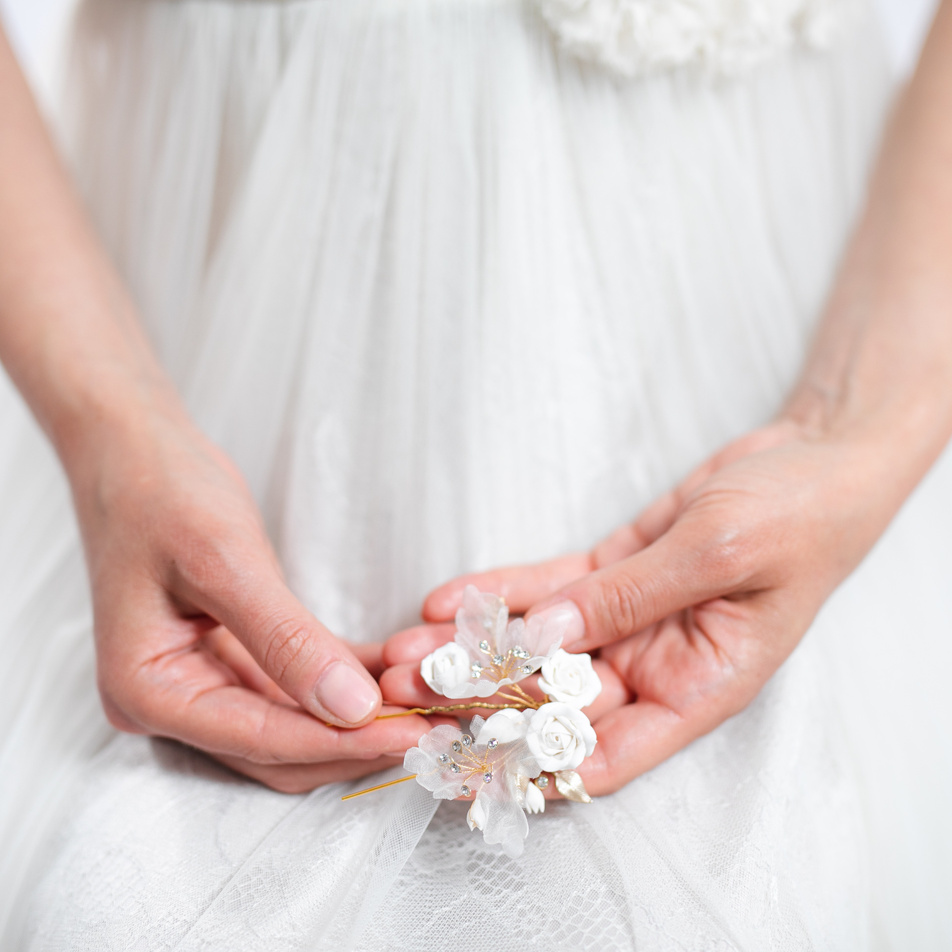 Mekana i nježna ukosnica od svile i gline. Komad nakita je u potpunosti ručno izrađen u našem studiju. Sve cvjetne komponente su ručno rađene od gline i svile, ukras je ručno dorađen do najsitnijh detalja. Ukras se može nositi na više načina jer nije prevelik te se lako može ubaciti bilo gdje u kosu.
