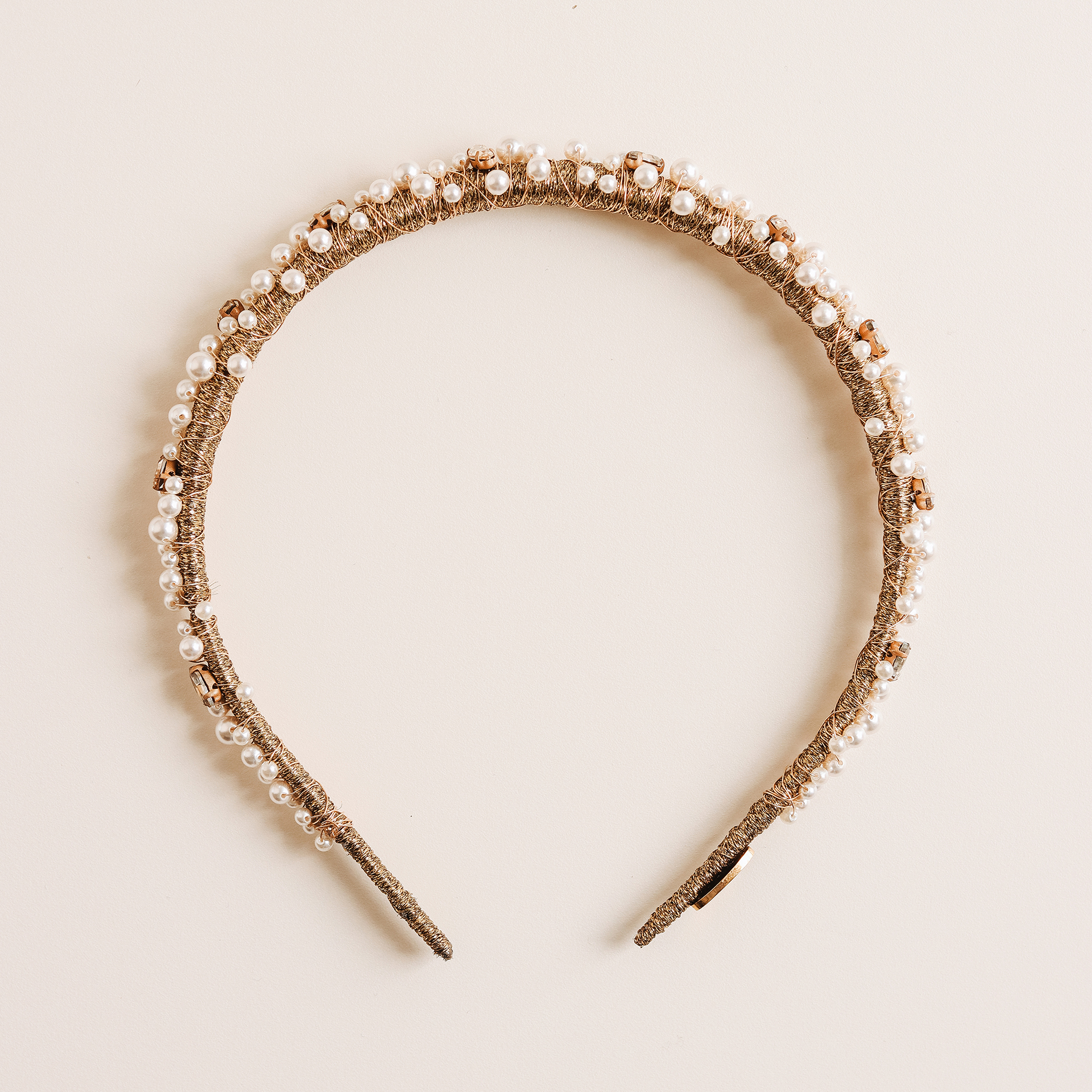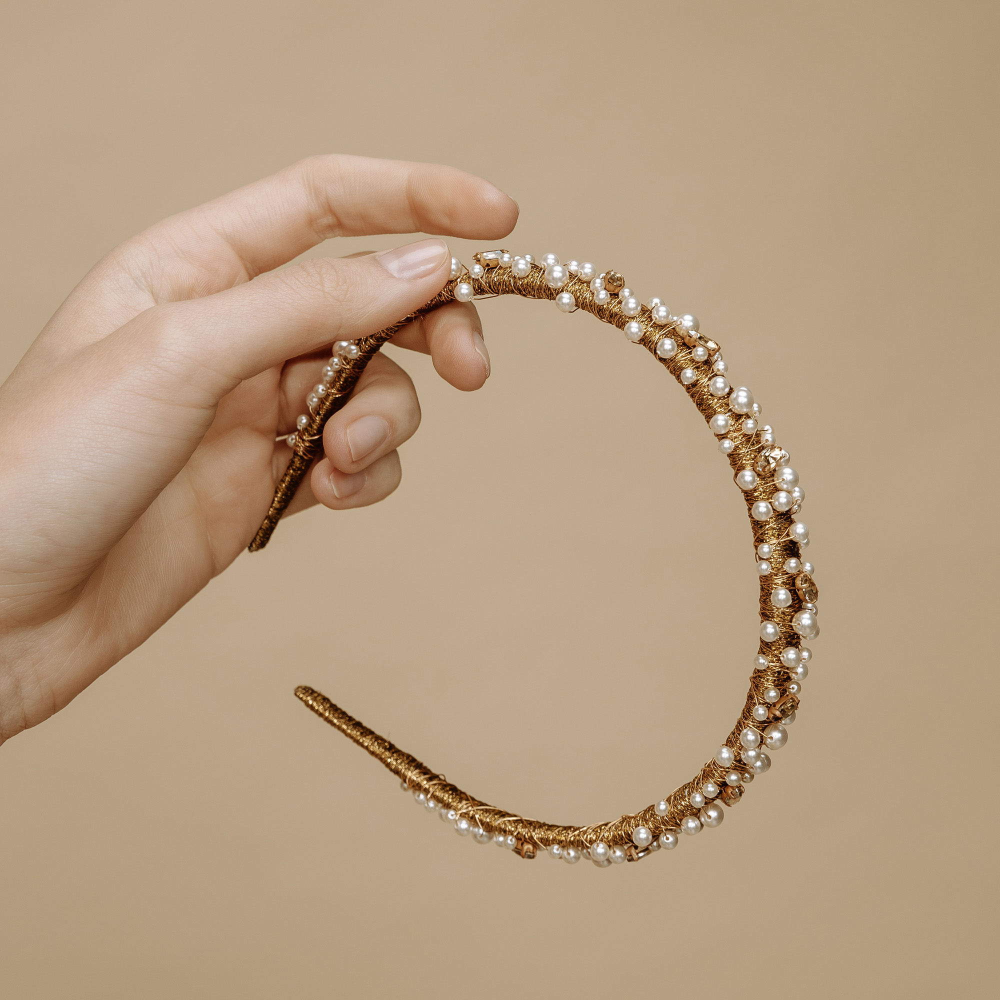 Elegantan luksuzni biserni rajf prožet SERINITY perlama, zlatnim koncem i cirkonima. Ukras je ručno dorađen do najsitnijih detalja. Rajf je ručno motan u kvalitetni konac zlatnog tona. Rajf je fleksibilan i prilagođava se glavi te ne stvara bolove iza ušiju. Boja konca može biti srebrna ili zlatna.